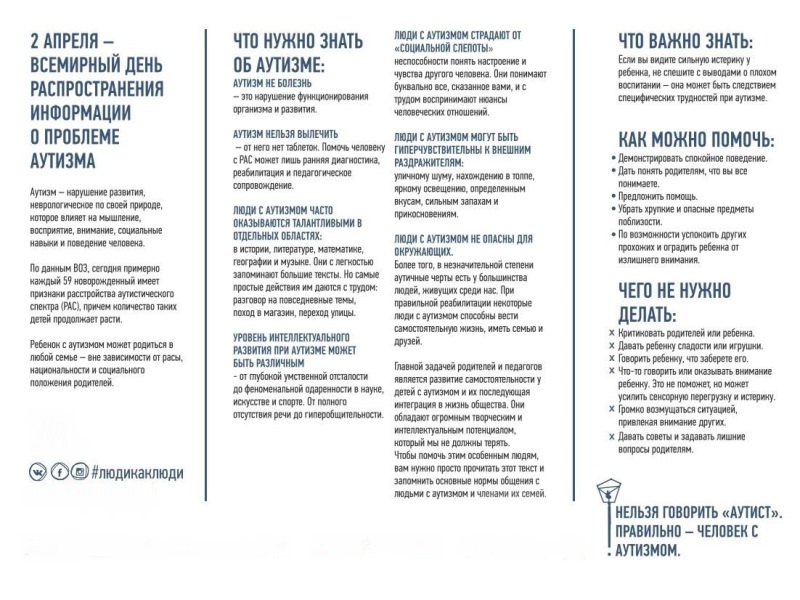 В отделении дневного пребывания для отдыхающих состоялась акция «Зажги синим» в рамках Всемирного дня распространения информации об аутизме. Акция проводится в знак солидарности с людьми, страдающими аутизмом, и их семьями. Ее цель заключается в информировании общественности, так как без понимания проблемы никогда не будет готовности общества принять людей с расстройством аутистического спектра. Отдыхающим были розданы буклеты, с информаций о том, как вести себя, оказавшись рядом с людьми- аутистами.