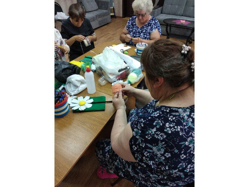 С отдыхающими отделения дневного пребывания на кружке "Волшебный клубочек" были изготовлены интерьерные композиции "Ромашка".