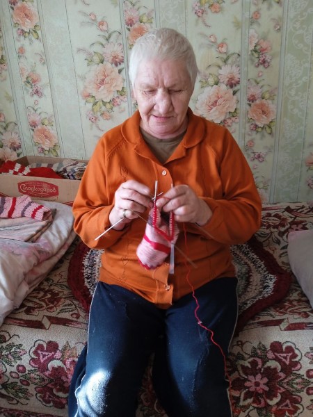 Обслуживаемая отделения социально-бытового обслуживания на дому №7 Цветкова В.М. вяжет теплые носки для участников СВО