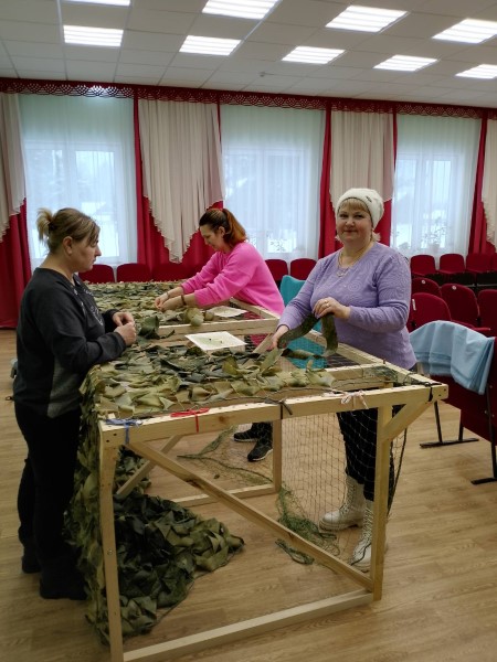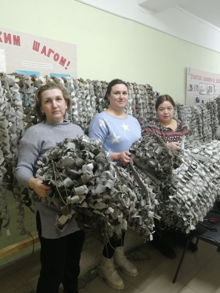 Социальные работники отделений социально-бытового и социально-медицинского обслуживания на дому п. Шеманиха принимают активное участие в плетении маскировочных сетей для СВО