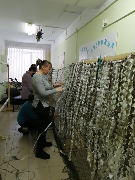 ГБУ «КЦСОН Краснобаковского муниципального округа» продолжает активно выполнять работу по оказанию помощи участникам СВО. Мы изготовили и отправили в зону СВО 5 маскировочные сетей. Работают сотрудники с тканью разных цветов. Основная гамма должна соответствовать ландшафту, ведь одна местность покрыта снегом, а другая – соломой и травой.