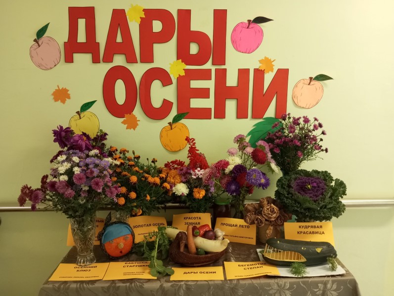 5 октября открылась выставка «Дары осени», приуроченная к Декаде пожилых людей. На выставке было представлено много интересных композиций. Обслуживаемые изготовили оригинальные и гениальные поделки, используя разнообразные приемы и методы. Были представлены поделки из овощей и фруктов, листьев, цветов и других видов природного материала. Все поделки, букеты, картины получились очень красочными, яркими, оригинальными, уникальными и разнообразными.