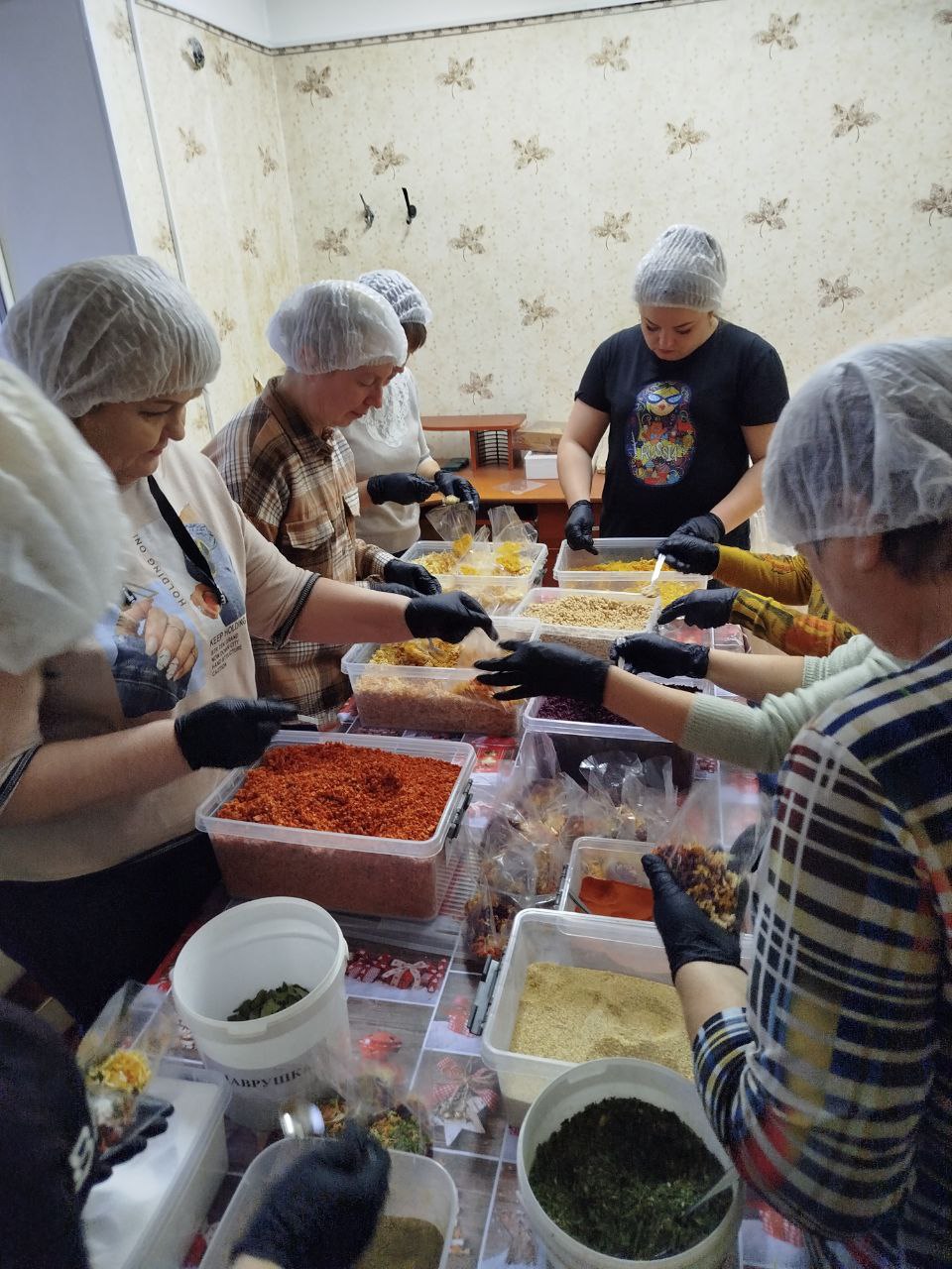 Сотрудники ГБУ "КЦСОН Краснобаковского муниципального округа" продолжают принимать участие в изготовлении сухих супов и каш для дальнейшей отправки в зону действия СВО. Высушенные овощи с мясом и специями в пропорции фасуют по определенным стандартам. Один- два таких пакета, и у ребят в полевых условиях будет домашний суп.