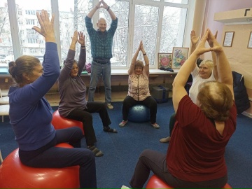 Специалист по реабилитации Гурьев А Л. не дает скучать нашим подопечным. Фитнес 60+ "Настроение, игра, здоровье". В игровой и не принужденной форме восполняем дефицит эластичности мышц, гибкость суставов, координацию движения, повышаем общую двигательную активность и хорошее настроение. Групповая работа.