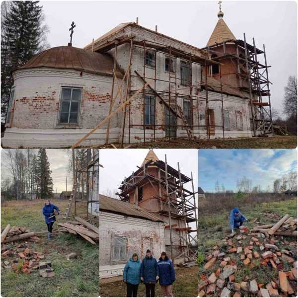 Наши «серебряные» волонтеры оказывают посильную трудовую помощь возрождающемуся храму – Троицкой церкви в д.Богоявление.